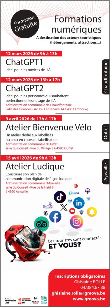Public cible : opérateurs touristiques (attractions, musées, hébergements, organismes touristiques,…) de la région OVA reconnus par Tourisme Wallonie.